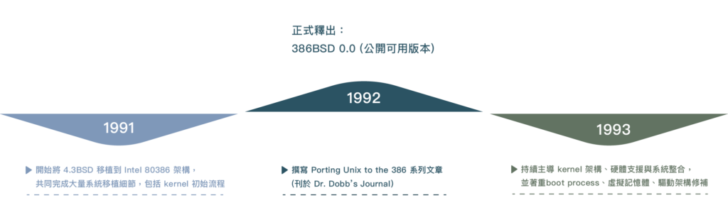 當時 Unix 主要存在於工作站與大型主機,而 Intel 386 PC 正快速普及。William Jolitz 和 Lynne Jolitz 做出大膽的嘗試:他們將 4.3BSD 移植到 Intel 386 架構,並以 386BSD 發布。