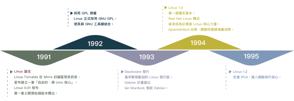 Linux 起源於 1991 年,由芬蘭學生 Linus Torvalds 發表第一版核心程式碼,並採用 GNU GPL 開放授權,使核心能與 GNU 工具鏈結合,形成自由、完整的作業系統。隨著 Slackware、Debian 等早期發行版在 1993 年推出,Linux 社群與生態開始成形。1994 年 Linux 1.0 釋出後,Red Hat 等企業參與,使 Linux 逐步進入伺服器市場。