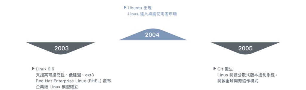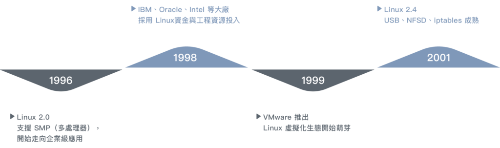 1996 年多處理器支援與企業投入,讓 Linux 在資料中心獲得技術優勢。2000 年代,隨網路服務普及,Linux 成為 LAMP 架構與網路主機的核心平台。2007 年 Android 基於 Linux 核心問世,帶動 Linux 在行動裝置上快速擴散。同時,AWS 等雲端平台採用 Linux,奠定其在雲端基礎架構的主導地位。