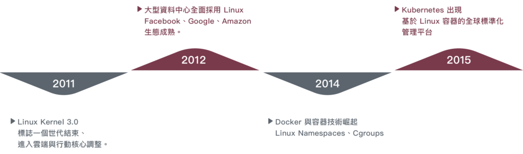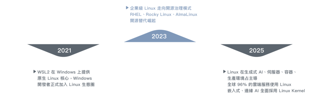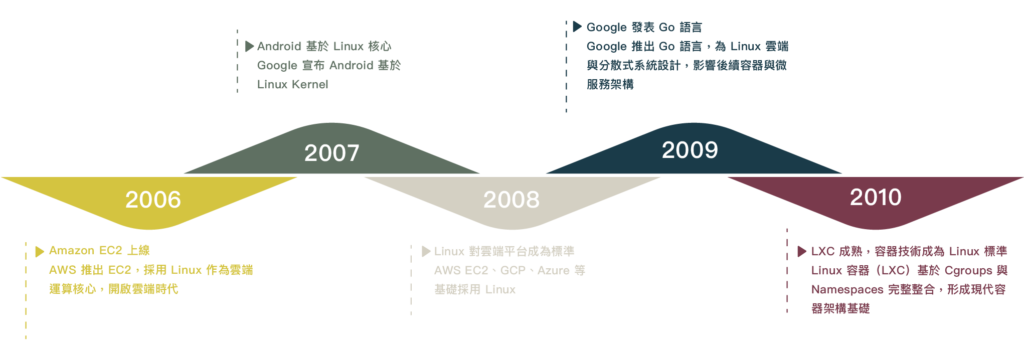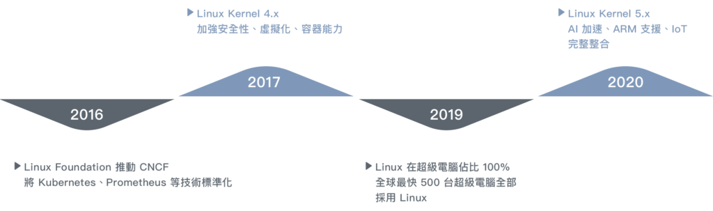 2010 年後,容器與 Kubernetes 出現,Linux 成為雲原生標準;2019 年起,全球最快 500 台超級電腦全部採用 Linux,展現其在高性能運算領域的統治力。今日,Linux 已深植於伺服器、雲端、行動、AI、IoT 與超級計算等領域,成為現代科技基礎架構的重要核心,並持續由全球社群共同維護與發展。